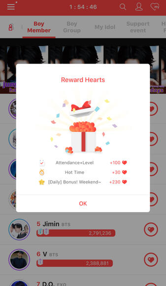 ★ HEART BOX: da click en cualquier imágen o gif publicado en la comunidad de Jimin y verás un corazón rojo con un signo de interrogación en la parte superior de la imagen / gif, haz clic en el y puedes obtener 7, 20, 100 o 1000 corazones. Puedes hacer clic en 5 corazones cada 4 horas. Si te aparece la opción de ver un AD, puedes mirarlo, recolectar los corazones que te da al hacerlo, despues cierra la imagen de jimin y vuelve a darle click a la imagen / gif de jimin y al corazón con signo de interrogación y obtenen los corazones que te da. Hay un límite máximo de 10 veces en 4 horas (5 veces normales + 5 veces viendo los anuncios). Si ya no puedes dar clic en el corazón te aparecerá el mensaje "Mejor suerte la próxima vez", así que vuelve a hacerlo después de 4 horas.